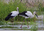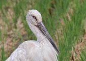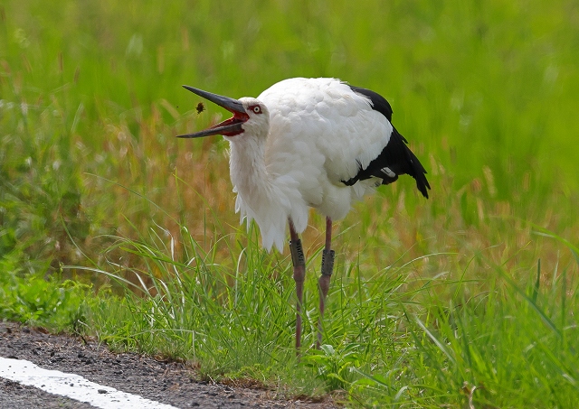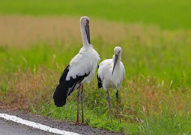 ◆某ローカル民放ニュースで、近辺に「コウノトリが6羽も集中して飛来」と流したらしい。私がそれを知ったのは、ネットのニュース・サイトからだった。その場所はこの5月以来2羽・3羽と、しばしばコウノトリが観察されているところ。これは個体確認しておくべき…と、酷暑に抗って昨日出かけてみた。◆観察できたのは5羽で、あと1羽は見つけられなかったが、後にU氏により存在が確認された。全て個体識別ができた結果は、福井県(鯖江2・小浜・越前市)由来の新顔コウノトリが4羽、島根・雲南市由来の新顔が1羽となった。予想に反して、5月以降に当地及び周辺で活動していた個体は、ただ1羽養父市生まれのオスが混じっていただけ。当地にしばしば姿を見せていた他の鳥たちは、いったい何処へ飛んで行ったやら……
