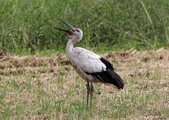 ◆午前中は彼岸のお墓掃除に費やして、午後はプリンターのカートリンジを買いにE店へ。そのついでに、ノビタキを探しに東に田園地帯へ行ってみた。今年の田園地帯はどうしたことか、大豆畑が大幅に減少していた。確か黒大豆の産地化が定着していたはずなのだが・・・。もしかして、これは昨年からの米価高騰の影響かもしれん。◆大豆畑に巣くう羽虫類を目当てに、この時期ノビタキが集まってくるのだが、時期がちょっと早かったようで、一羽も観察できず。福井県を出自とするコウノトリ3羽(J0936/J0722/J0866)が稲刈り途上の田んぼに。ため池の端でコチドリ数羽がいたぐらい。