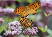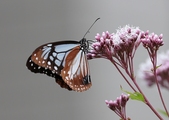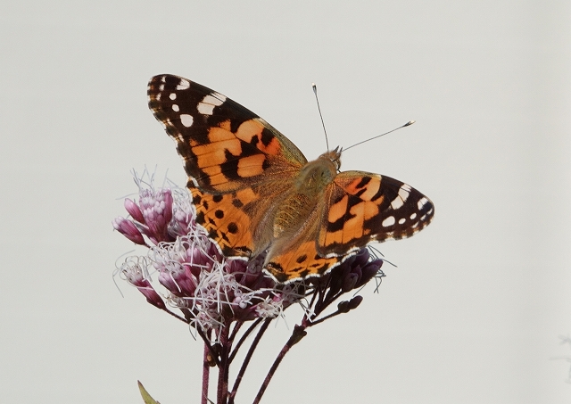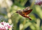 ◆16日からの4日間、ほぼ昼間は家を空けていたので、この間のアサギマダラは、家人の話によると見なかったとか。もちろんフジバカマの側で、常時監視していたわけではないので、本当のところは不明。ただ、天気も不順で風が強い日が続いたこともあってか、昨年に比べると少ないように感じる。私が視認できたのは今のところ4頭だけ。◆我が庭のフジバカマは今が満開状態で、いろいろな昆虫を誘引している。ヒョウモンチョウ類のほかにも、キタテハやアカタテハーもしかしたらヒメアカテタハか?ーなどなど。ホバリングしながら花の蜜を長刎で吸う、まるでハチドリのような不思議な生物も。この蜂でも蝶でもなさそうな生物の名前が、ネット検索してみてやっとわかった。どうやら蛾の一種のクロホウジャク(黒蜂雀)というものらしい。